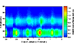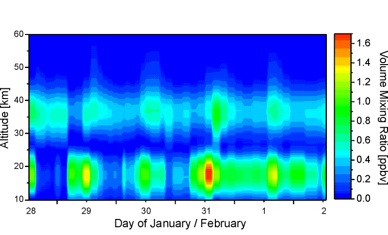 Time series of ClO over Kiruna lasting from 28 January to 2 February 1998. The lower ClO layer