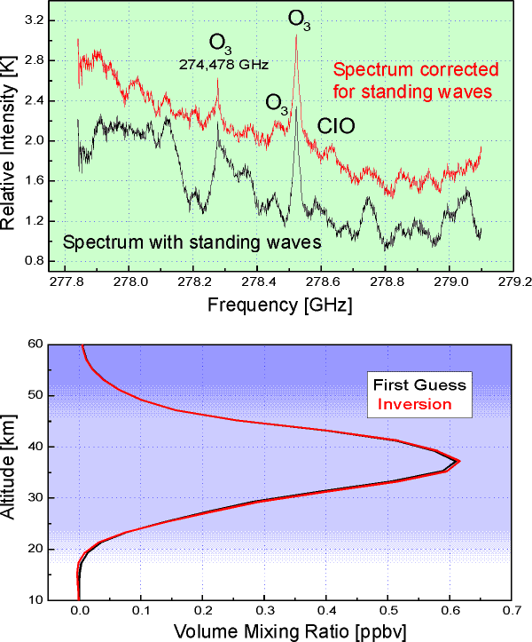 Lower graph: Retrieved ClO vmr profile. There is no lower ClO layer at an altitude