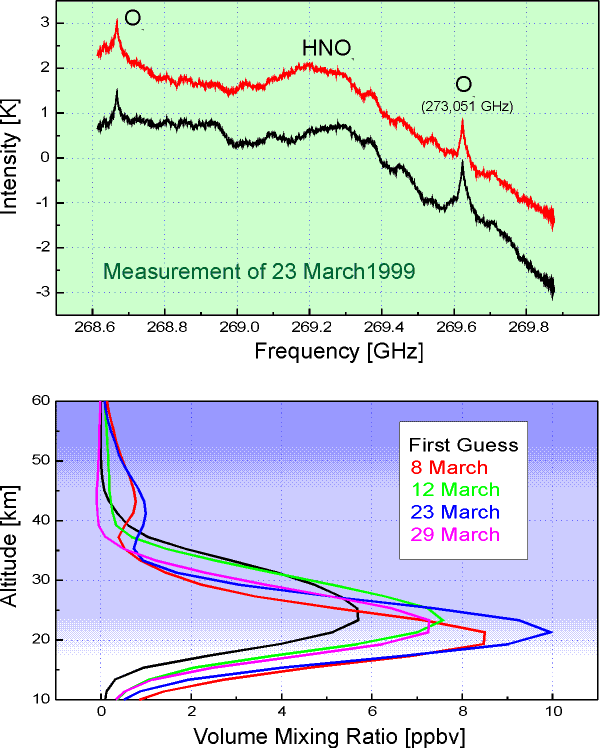 Lower graph: Retrieved vmr profiles of HNO3 in March 1999.