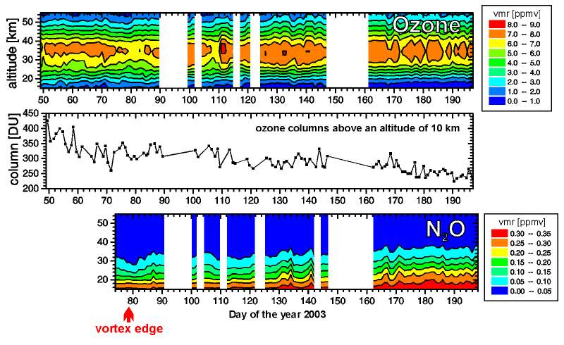 and nitrous oxide (lower panel). Around day 79 the edge of the polar vortex was